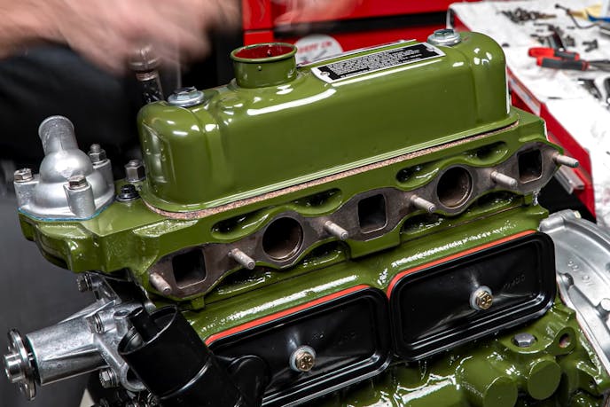 Both the cylinder head and engine block are made from cast iron. The heads are a two-valve-per-cylinder overhead-valve design, with the intake and exhaust ports sharing a single side of the cylinder head. The physically-small block only has three main journals. The 1.275-liter displacement was achieved with a 2.780-inch bore and 3.200-inch stroke, which was right at the physical limit for the block.