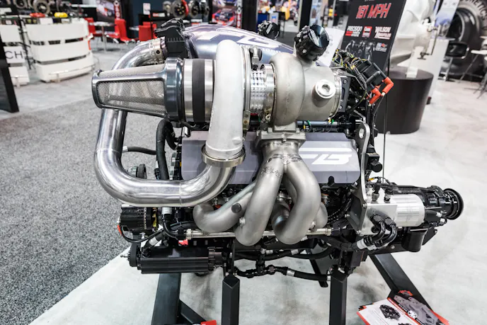 The engine is based on a big-block Chevy design but has been custom-engineered throughout.