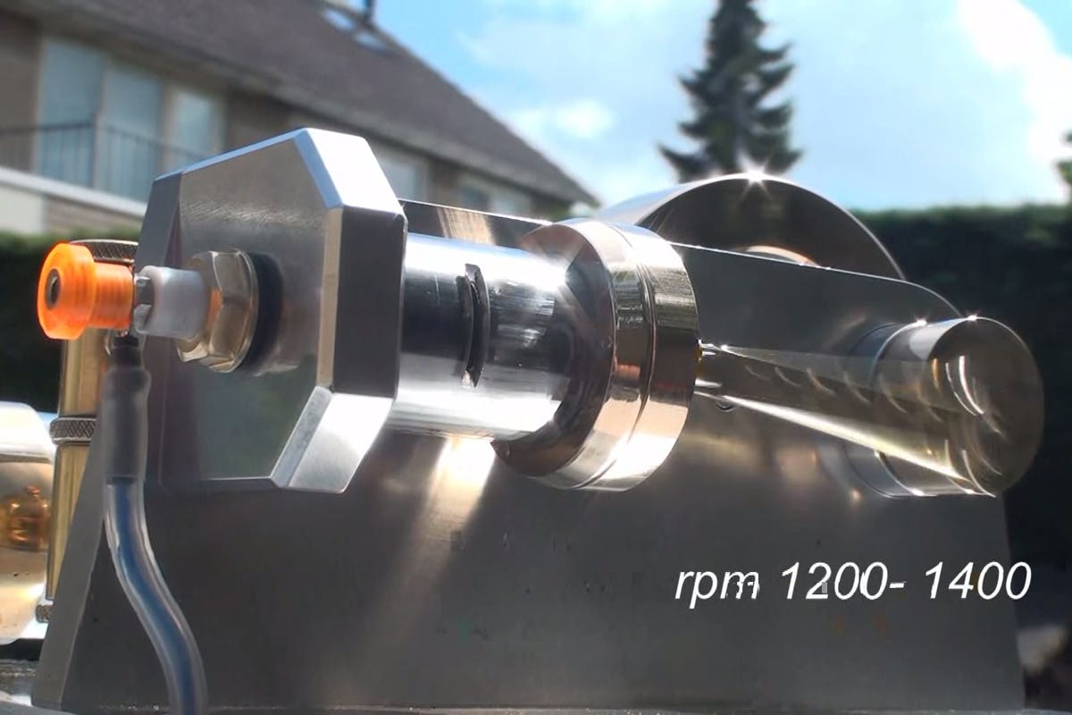 The simplicity of this unit is beautiful. Using a glass cylinder and graphite piston, Visser constructed the engine to show off the combustion process. A flying magnet triggers the miniature spark plug to start combustion, while the single connecting rod and machined crankshaft whir away as the engine runs.