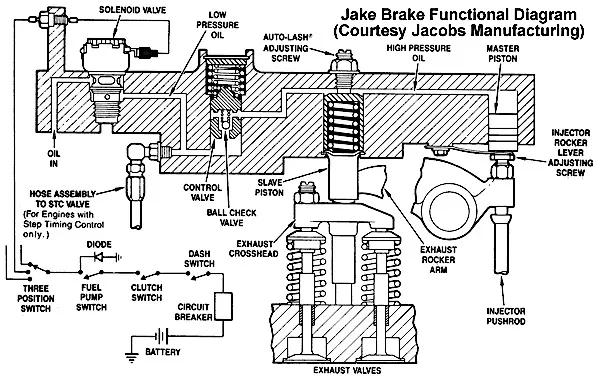 Another type of diesel braking system is the engine compression release brake, commonly referred to as a “Jake Brake.” This design utilizes a set of hydraulic pistons, a solenoid, and a check valve to modulate the exhaust valve outside of its normal duty cycle.