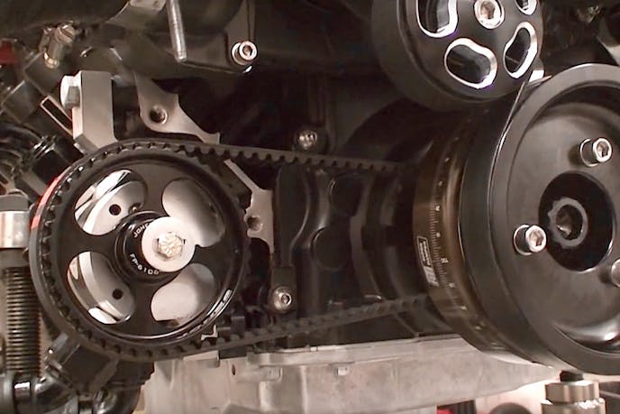 Nelson admits this engine is “overbuilt,” but that was the wish of the owner. It starts with an RHS tall-deck aluminum block that fitted with a Bryant billet crank, Oliver billet rods and an Aviaid dry-sump system. The pump is turned by a custom ATI damper with an integrated cog pulley gear. The cylinder heads were CNC ported by West Coast Racing Cylinder Heads.