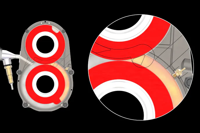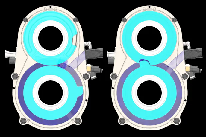 First, let’s dive into how the engine works. Using a method that is somewhat reminiscent of a positive displacement supercharger, the engine utilizes two pairs of what the company calls “Isolator Rotors” — one pair for intake and compression, and the other for power and exhaust. Each pair of rotors has a single section with a protuberance and a corresponding cavity. During the engine’s rotation, the male rotor acts as the piston to create intake suction and compression, while the female rotor acts as the anvil to direct the compressed charge into the pre-combustion chamber.
