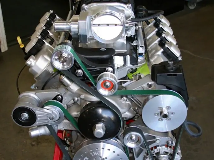 The LC32 drive systems are designed to work with all accessories and fit in the majority of popular applications. This engine features a special bracket that allows the use of a C6 Corvette oil pan conversion while still mounting the A/C compressor in the original location.