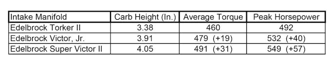 The test engine was a 400ci small-block Chevy making nearly 550 horsepower. We assembled a chart that lists average and peak horsepower as well as the carburetor mounting height. By studying the chart, it’s clear that carb height plays an important role in both average torque and peak horsepower. The chart also indicates the power difference between the short Torker II and the taller manifolds. A 57-horsepower increase is certainly worthy of notice!
