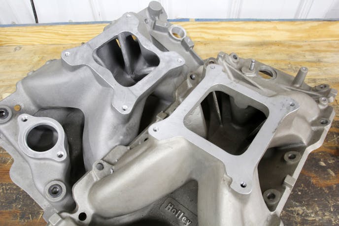 Our friends at Westech performed a major dyno test a number of years ago that tested a whole series of single-plane small-block Chevy intake manifolds. One major detail that jumped out at us after all the data was assembled was that power for both average and peak horsepower was directly related to carburetor mounting pad height. This was measured between the rear carb mounting pad and the rear china wall point of the manifold. This sounds overly simplistic, but the data did not lie. We’ve pulled details from three Edelbrock small-block manifolds to illustrate this point.
