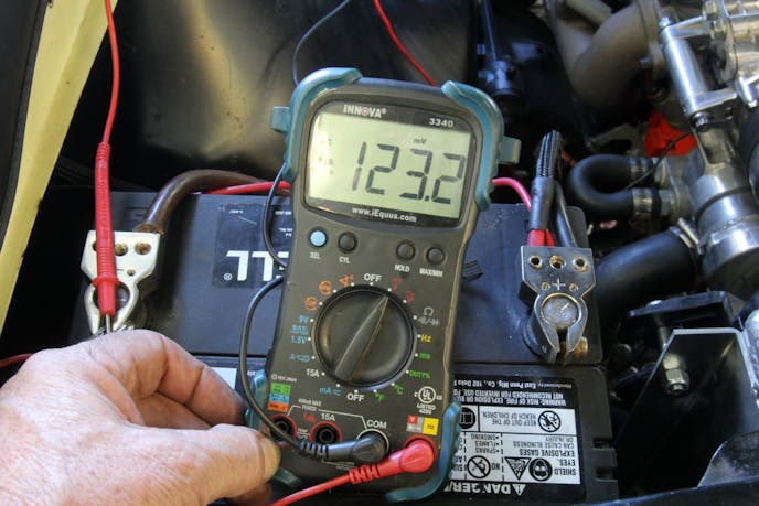 A quick way to do a loaded resistance test on a battery cable is to connect a digital voltmeter to both ends of the cable and monitor the voltage displayed while cranking the starter motor, preferably with the ignition disabled. The voltage should read 0.5 volt or less. If the voltage is higher than 0.5 volt, this is an indication of excessive resistance. This is a reading from an LS engine swap with a permanent magnet starter and good cables and is only 123 milli-volts, which is a very low 0.12-volt.