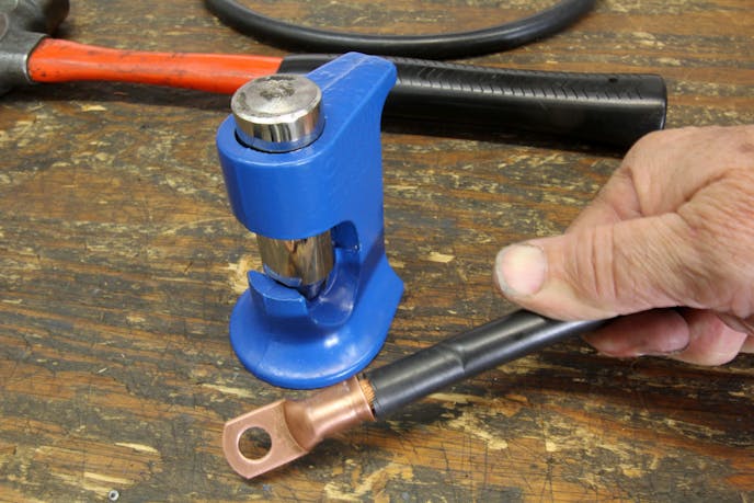 The best battery cable is multi-strand copper 00-gauge welding cable. Use a proper crimping tool like this Moroso tool from Summit Racing to create a solid connection between the copper terminal and the cable.