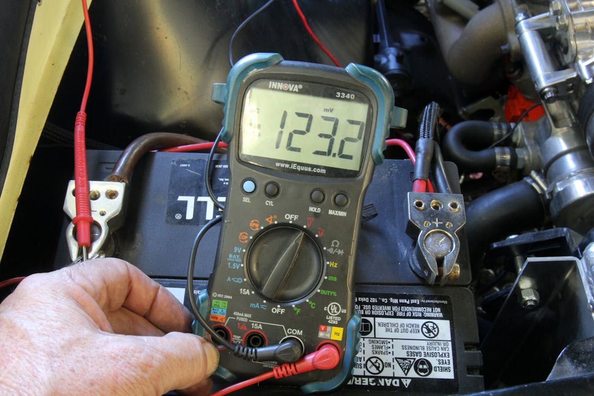 A quick way to do a loaded resistance test on a battery cable is to connect a digital voltmeter to both ends of the cable and monitor the voltage displayed while cranking the starter motor, preferably with the ignition disabled. The voltage should read 0.5 volt or less. If the voltage is higher than 0.5 volt, this is an indication of excessive resistance. This is a reading from an LS engine swap with a permanent magnet starter and good cables and is only 123 milli-volts, which is a very low 0.12-volt.