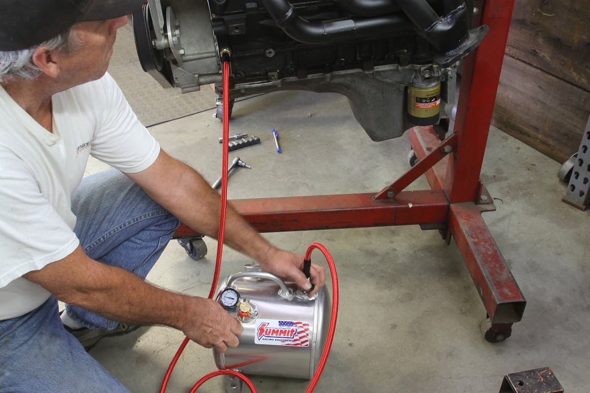 With a freshly rebuilt engine, it’s a really good idea to pressure lube the engine with a dedicated pressure device. Summit sells an inexpensive pressurized container (P/N SUM-CSUM-9166) that can be filled with enough oil to pressure lube the engine before starting. Melling also sells a very nice pressure lubing tank (PN MPL-201). If you feel adventuresome, you can make your own oil pressure pre-luber for much less money using a 2-1/2-gallon plastic bucket and lid fitted with a small-block Chevy oil pump bolted to the lid. Extend the pickup to the bottom with 5/8-inch rubber hose and add a pressure outlet fitting from the pump to allow connecting to the same pressure port in the block.