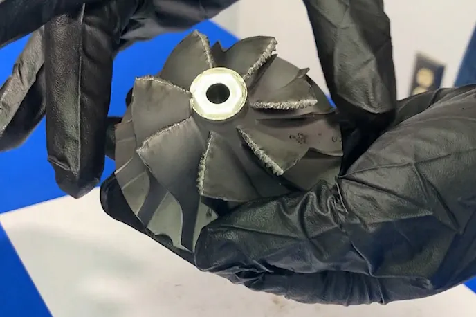 “Not only does the damage to the blades on the wheel affect aerodynamic performance, but it can also affect balance. An imbalance will decrease [the turbocharger’s] longevity by placing major stresses on the bearings, and it can also increase noise from the turbo,” explains Flynn.