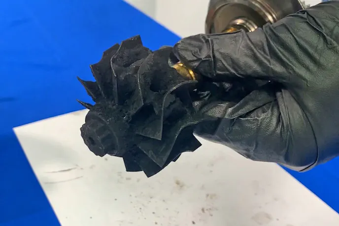 “On the turbine side, it’s a little harder to diagnose the source. We’ve seen anything from a bolt or a nut to exhaust valve seats, or exhaust valves themselves, spark plugs, even broken up-pipe bellows,” Flynn says. “If you ever see F.O.D. on the turbine wheel, there’s a good chance something is coming apart in the motor, or something was left in the motor.”
