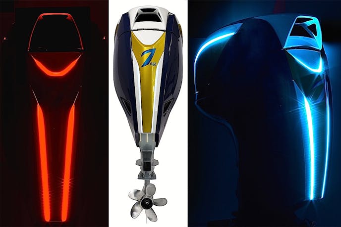 But how many engines are you aware of that feature integrated LED lighting on the cases? Come on, that’s pretty cool. Aside from the gimmicks, these outboards are very sophisticated. They come with closed-loop cooling circulating special seawater-safe coolant. Other features include stainless-steel tubular headers, drive-by-wire throttle control, 1.9-liter TVS supercharger and intercooler, 8-quart wet-sump oiling and 9:1 compression ratio. The 627 is differentiated from its smaller brother by what the company calls a “marine-specific high-turbulence combustion chamber.” The patented air-induction system separates raw water and salt spray as it passes through the cowling system. The engine has a 5,500 rpm redline and runs on 89 octane fuel.
