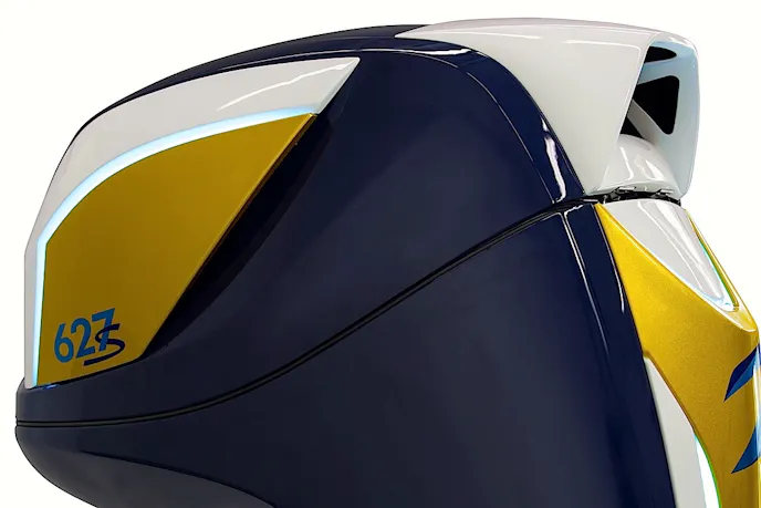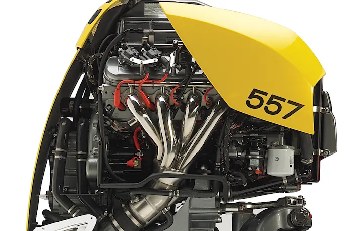 But how many engines are you aware of that feature integrated LED lighting on the cases? Come on, that’s pretty cool. Aside from the gimmicks, these outboards are very sophisticated. They come with closed-loop cooling circulating special seawater-safe coolant. Other features include stainless-steel tubular headers, drive-by-wire throttle control, 1.9-liter TVS supercharger and intercooler, 8-quart wet-sump oiling and 9:1 compression ratio. The 627 is differentiated from its smaller brother by what the company calls a “marine-specific high-turbulence combustion chamber.” The patented air-induction system separates raw water and salt spray as it passes through the cowling system. The engine has a 5,500 rpm redline and runs on 89 octane fuel.