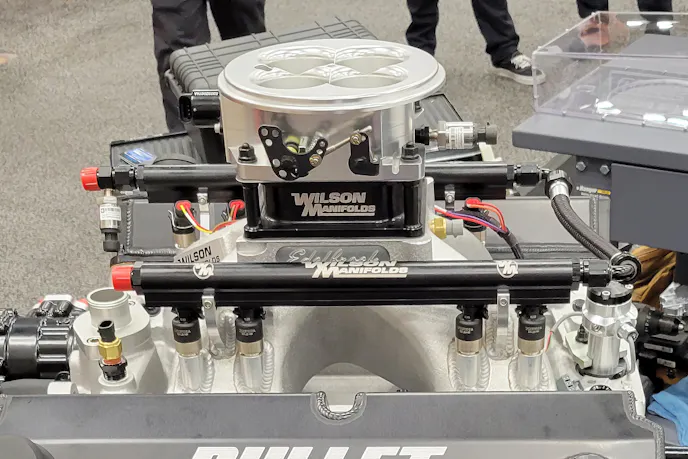Sitting atop the carb pad is a 2-inch open spacer from Wilson. The idea being that any increase in plenum volume in an EFI application is a positive. Sitting atop that spacer is a Holley 2,000 cfm four-barrel throttle body. CNC-machined from billet aluminum, the 4500-pattern throttle body features four 2.25-inch throttle bores with a progressive linkage. That means that it will not only drive better on the street, but also offer all the airflow the engine can handle at wide-open throttle.