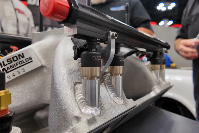 A set of Holley EFI 83-pound-per-hour EV1-style low-impedance injectors (P/N: 522-838) provides fuel to the combination. Rated at a maximum horsepower of 1,325, these injectors will handle the street as well as the track. Besides reliable flow and operation, the Holley EFI injectors feature a “tri-cone” spray pattern for even delivery of fuel into the engine. The 83 lb/hr injectors are housed in a set of Wilson fuel rails mounted to the manifold as part of the EFI conversion from Wilson.