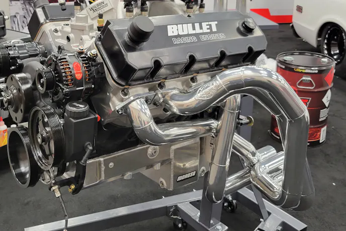 The final piece of the puzzle on the PRI Show floor was the headers. These absolute works of art from Lemons Headers (P/N: BBR-545) are a 4-into-1 design, with 2-3/8-inch diameter individual primary tubes, connecting to a 4-inch diameter collector, and are secured via a bolted solid tab. Designed to fit a stock chassis application of the 1968-’72 Chevelle, the clearance in that application was of the utmost design importance. Lemons then sent the headers out to be ceramic coated, to give the winner the absolute best set of headers possible.