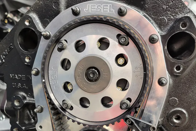 In order to keep the camshaft in sync with the crankshaft, we used a Jesel belt-drive timing set (P/N: KBD-35500). Designed for a raised-cam big-block Chevy application, the Jesel belt-drive uses a billet aluminum 2024-T6 spider, heat-treated steel crank pulley, and Grade-8 hardware throughout. The PTFE cam and crank seals are designed for high-vacuum applications, and have the patented Jesel HTD belt design to reduce the harmonics of the crankshaft being transferred to the cam. Additionally, the external cam timing adjustment allows for 10 degrees of adjustment in either direction.