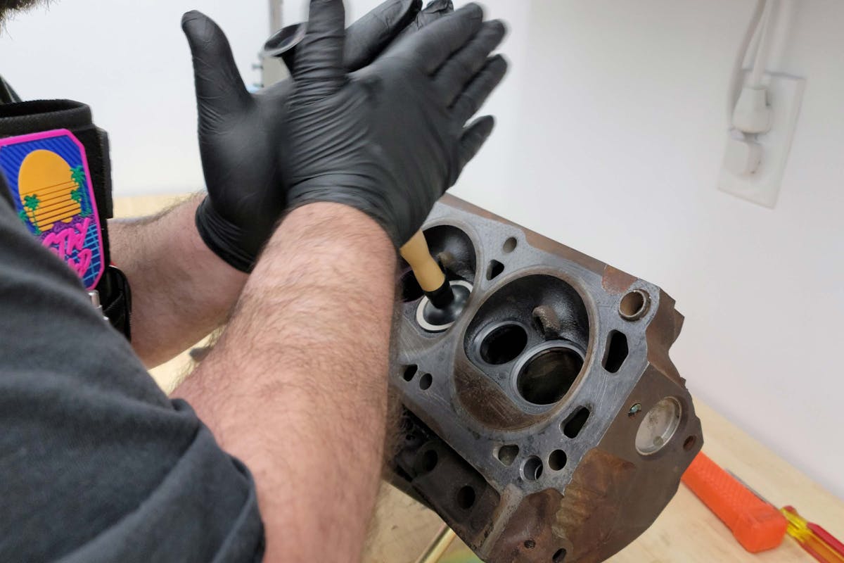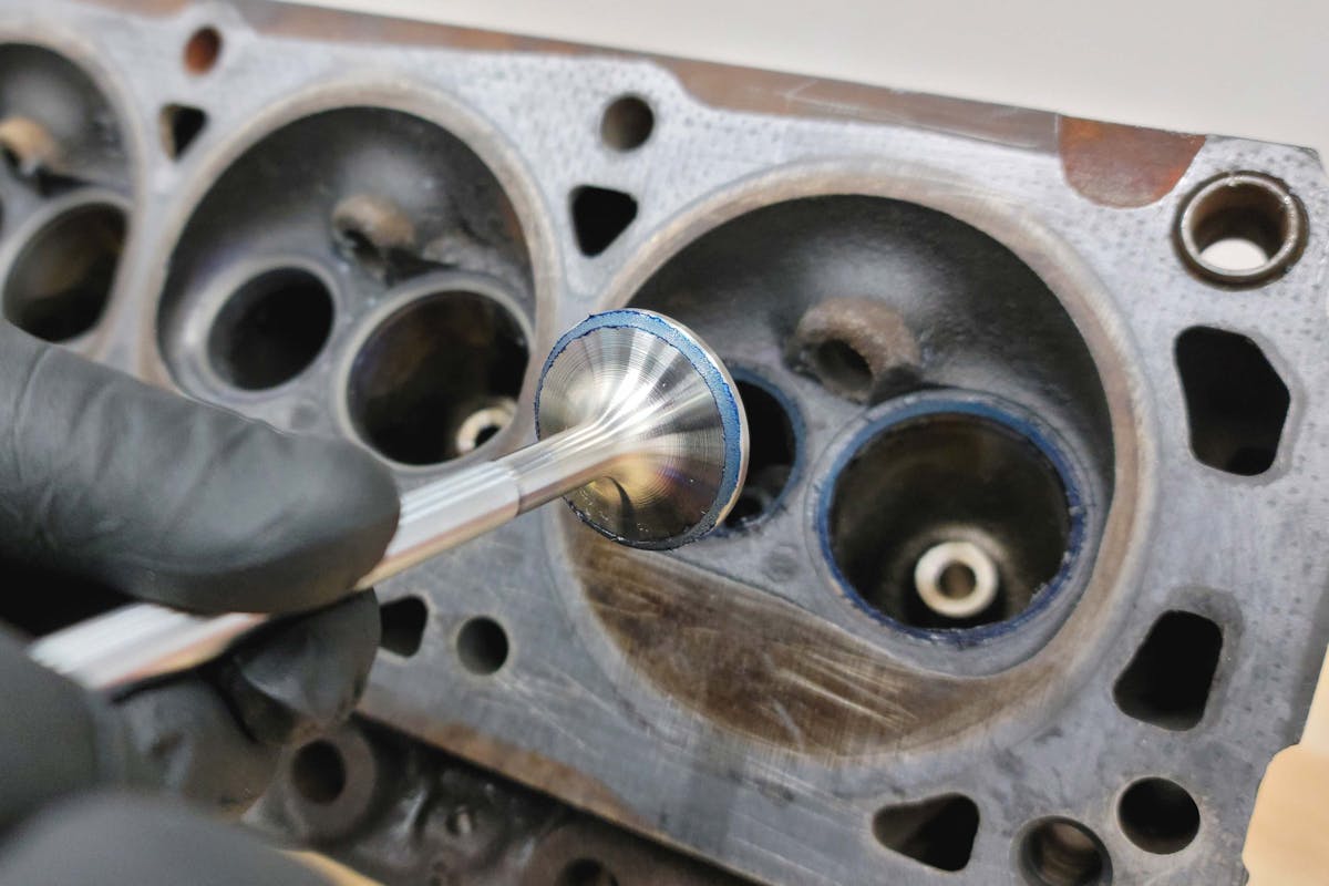 Now, with a set of exact replacement valves, and valve seats in great condition, it was time for us to lap the valves and then check the fit. Lapping valves is a fairly simple process that involves placing an abrasive compound between the valve register and the valve seat and rotating the valve back and forth to perfectly mate the two sealing surfaces. The compound breaks down from a coarse grit to a fine grit, making it a one-step process.
