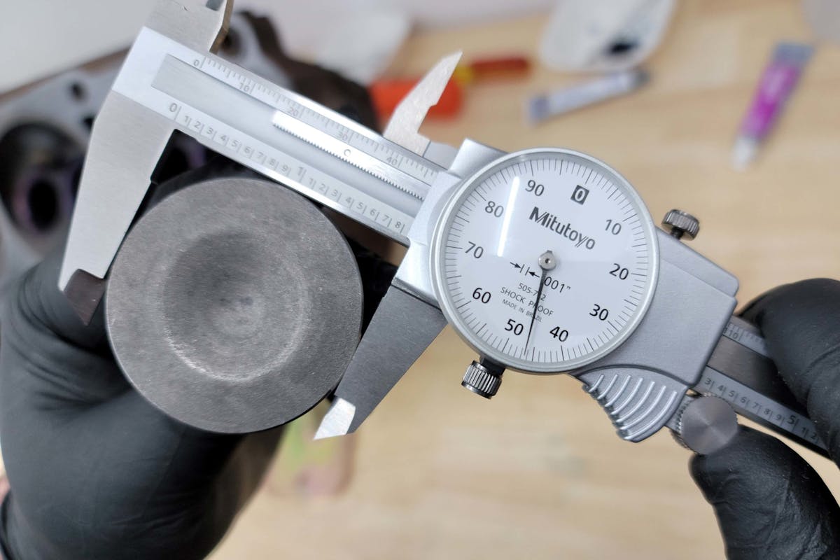 Once the lapping is complete, we place the Prussian Blue onto the valve seats, and press the valve into the seat, being careful not to rotate the valve. Once the valve is removed, the pattern of contact between the two surfaces will be visible on the valve’s register, verifying complete contact around the entire circumference. Everything on our assembly passed with flying colors, and we moved onto the other side of the cylinder heads.