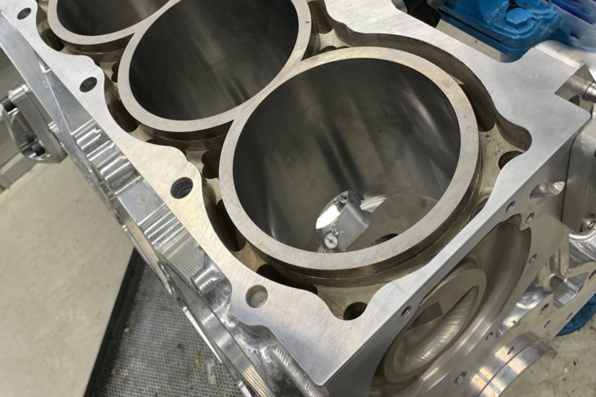 The oil pan is integrated into a girdled bedplate for torsional rigidity and harmonics while being easily serviceable. The bedplate features slightly larger fasteners (and more of them) to tie the main housing bore into the crankcase skirting, as well as evacuation ports for the modular dry-sump and evacuation pump. The engine is attached to the RP968’s chassis at both the front and back of the engine, causing it to be a stressed member.