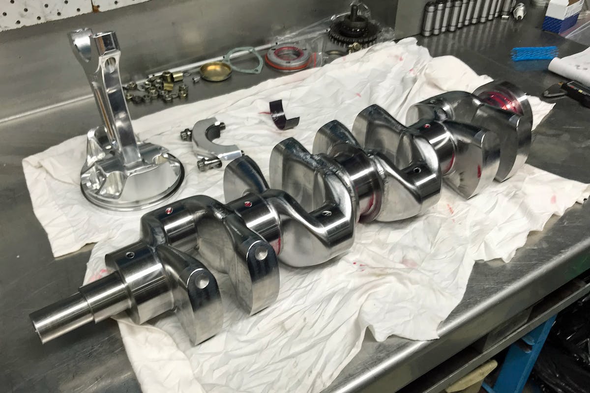 Crankshaft weight was kept in check with a billet unit, again from Elmer Racing. Modern design techniques using finite element analysis, and the “blank canvas” afforded from billet construction allows for weight savings through the use of narrow, profiled counterweights and piston-guided rods on a thrustless crankpin.