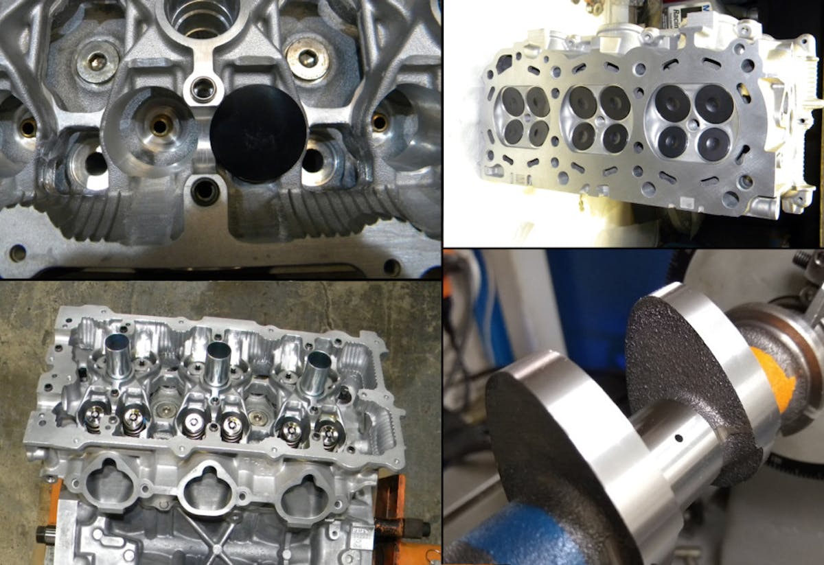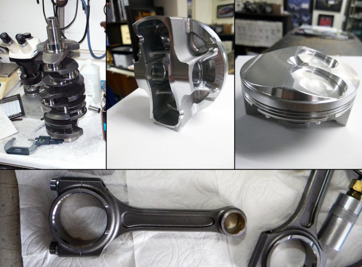 “We were lucky to make it all fit within the stock dimensions,” says Anis. The massive crank made packaging a bit challenging. Everything, from the oil squirters to the block itself, had to be massaged to fit the oversized crank. The valve reliefs in the pistons are extremely deep to accommodate the variable intake cam timing, and the ring grooves in the piston are up as high as they can be relative to those big pockets.