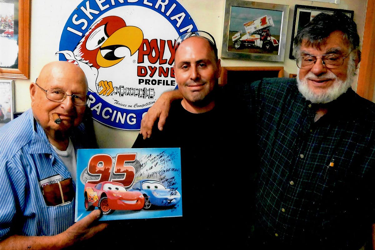 One thing that stands out about Ofria is how much of his business is about people. On the left is a photo of 1970 NHRA Winternationals T/F champ Larry Dixon, Sr. ( left, an old VHS customer), Ofria (center), and many-time NHRA World Champion Larry Dixon, Jr. In the center image, Ofria (right) celebrates Ed Iskenderian's (left) 95th birthday. Both displayed at the first-ever SEMA Show. On the right is Ofria's Valley Head Service team. He credits his crew at VHS for keeping things going. The man on the left, Ruben Pulido, has been with him for 33 years.