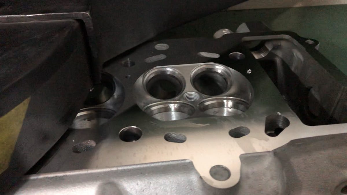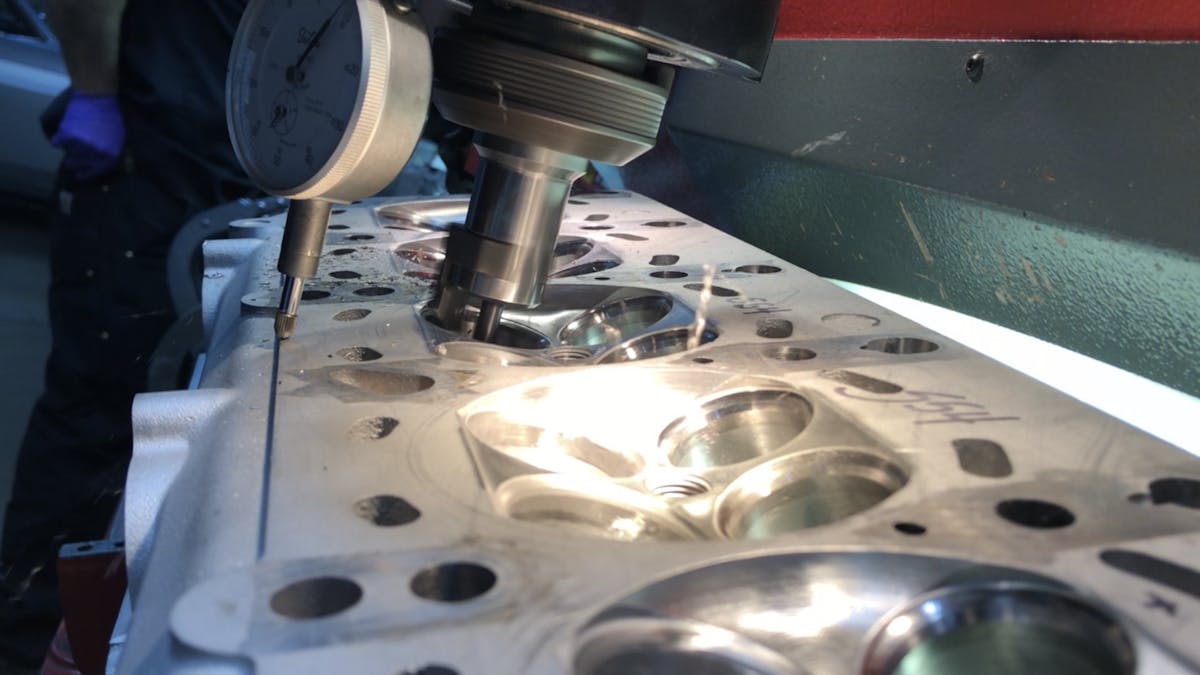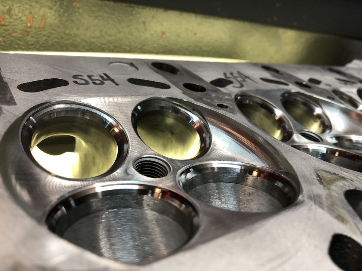 After port profiling and dressing, we look to simply smooth the combustion chambers’ sharp tooling marks. We also verify volumetric uniformity with a burette. Great attention is to be paid to seat profiling, given the increase in valve size on the exhaust. The valve seat serves two integral purposes: to sink heat out of the valve into the water jacket, and provide the port transition to feed the combustion chamber our valuable compressed (and often intercooled) atmosphere.