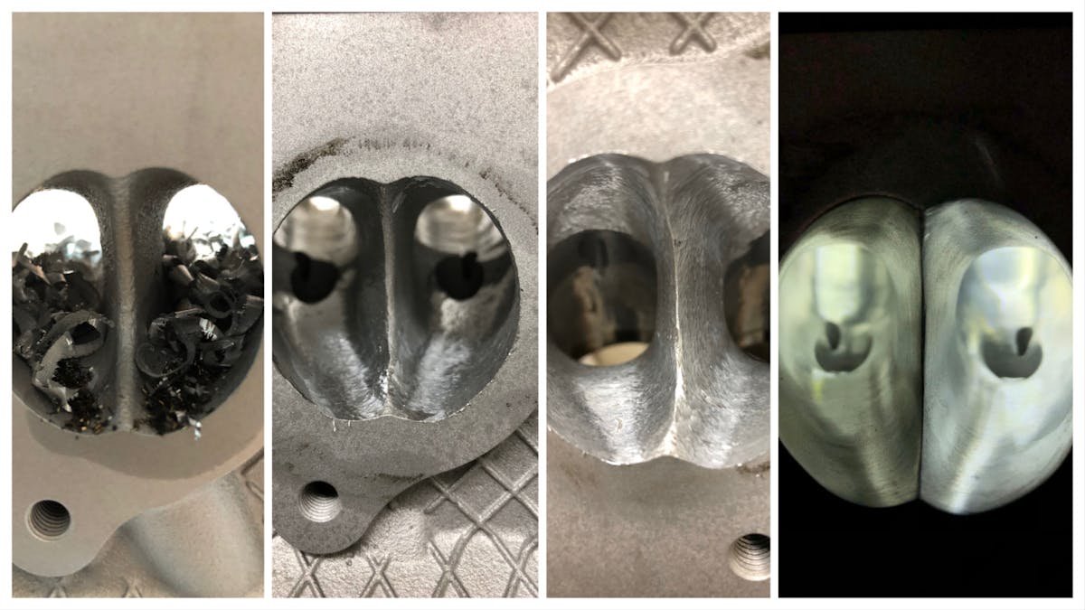 Once profiled, the exhaust receives 80-grit followed by 120-grit. We follow up with some light cross-buffing to knock down the texture for carbon control. The combustion chamber receives the same finish-massaging as the exhaust, knocking down high spots and tooling burrs to prevent any pre-ignition or glow-plugging.