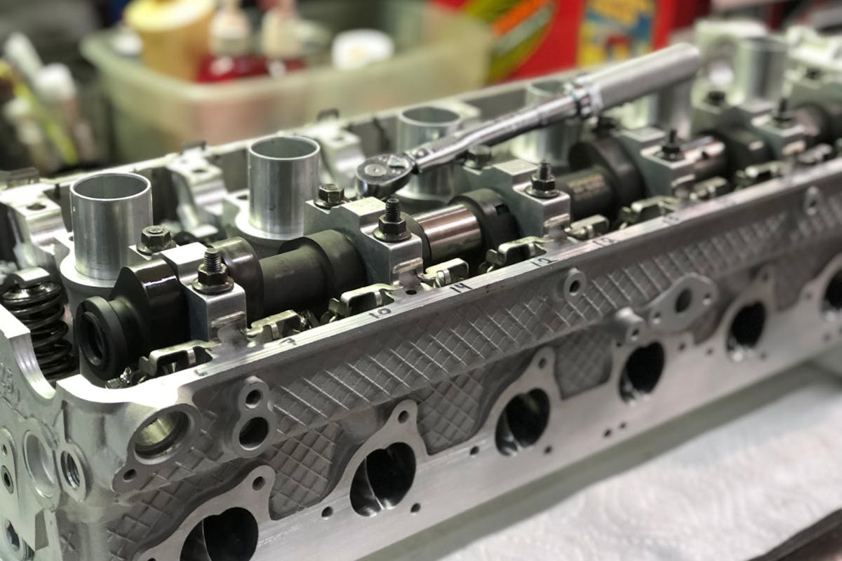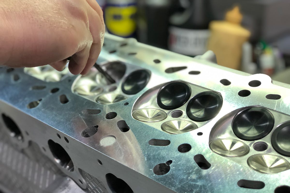 The seat profiling can be followed up with hand lapping to assure a properly mated seat-to-valve interface. Once the valve job is inspected and tested, the next step is deck-milling and flange inspection where the rotary PCD curls “sixes and nines” for an ultra-smooth and flat finish. A final part inspection happens at this point before hitting the parts washer. Once we have clean and appropriate parts, we bench-adjust the valves. We adhere to the cam manufacturer’s specifications and conclude final assembly with a final inspection.