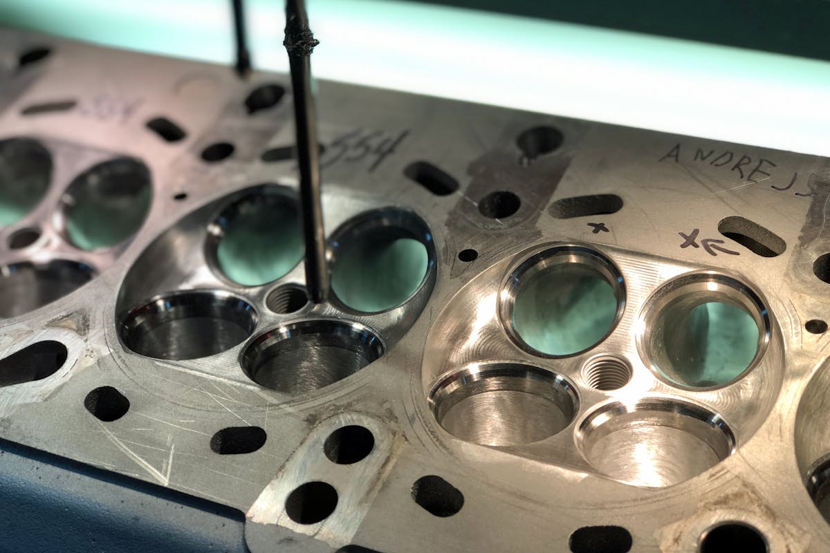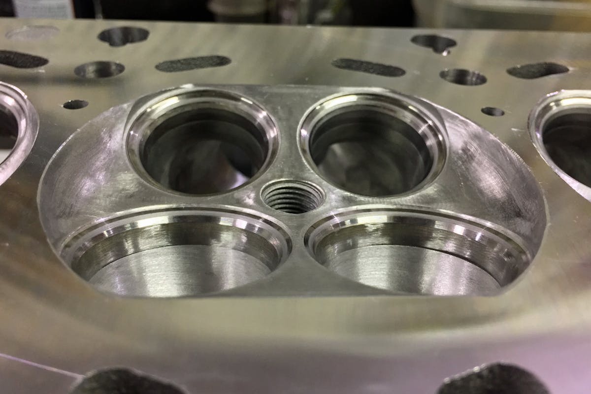 After port profiling and dressing, we look to simply smooth the combustion chambers’ sharp tooling marks. We also verify volumetric uniformity with a burette. Great attention is to be paid to seat profiling, given the increase in valve size on the exhaust. The valve seat serves two integral purposes: to sink heat out of the valve into the water jacket, and provide the port transition to feed the combustion chamber our valuable compressed (and often intercooled) atmosphere.