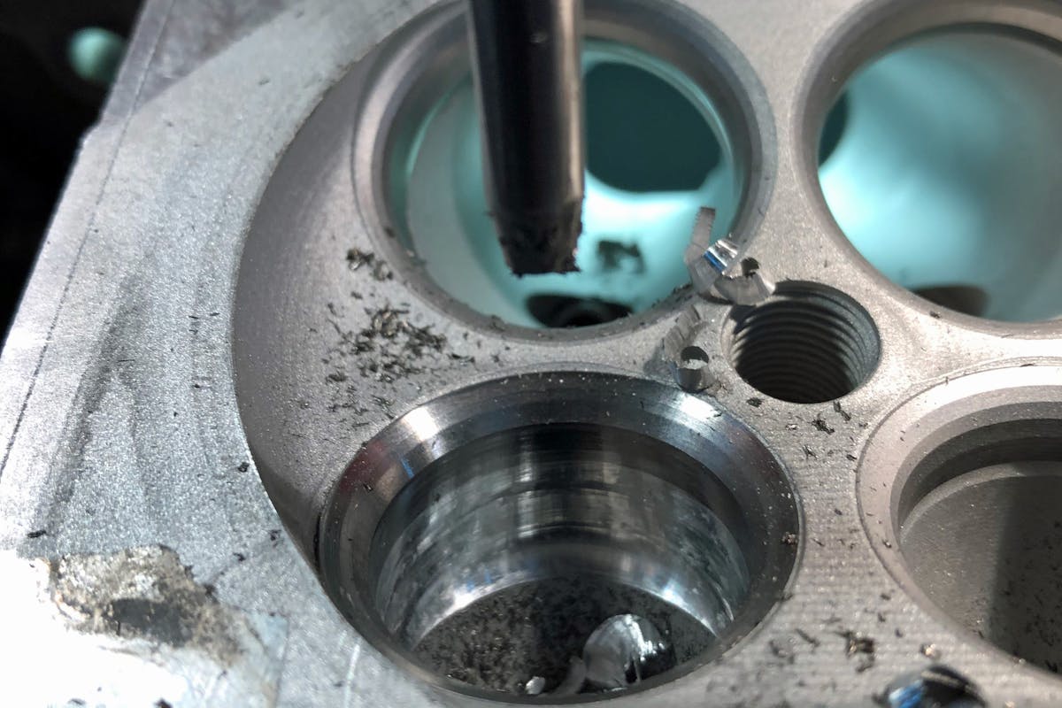 Without manifold flange fasteners in the way, we’re able to straight-edge and board profile the intake and exhaust manifold flanges by hand. It provides a smooth and flat mating-surface for a new gasket between the cylinder head and manifold. The cylinder head then gets jigged and precision leveled before we remove .002-.003 inch per-pass on the Rottler mill with a PCD insert. This leaves behind a smooth, MLS- or copper-head gasket friendly, mid-30s (Ra) finish. The chambers, port edges, and outside deck edges are deburred with a fat-flute rotary file before blowing the chips out.