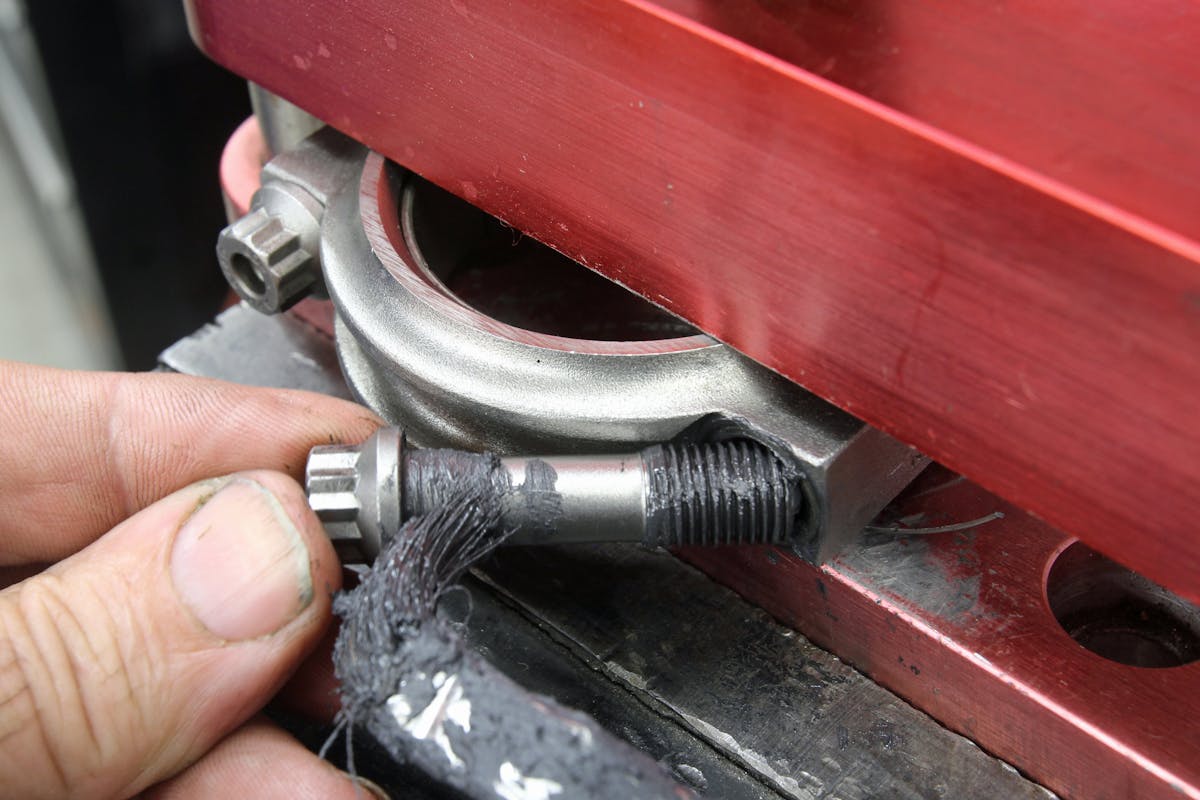 To hammer this lesson home, we lost a 355ci small-block Chevy on the dyno when a rod bolt failed because it had not been properly stretched. The under-torqued rod bolt nut eventually backed off after several hours of dyno testing, completely destroying the engine in the process. The cause was traced to a torque wrench that fell short by 10 lb-ft combined with new rod bolts and using engine oil as a lubricant. The resulting tolerance stack caused the failure. When we disassembled the engine, the rod bolt nut was laying in the bottom of the oil pan. All of the remaining rod bolts were badly under-stretched as well. Lesson learned.