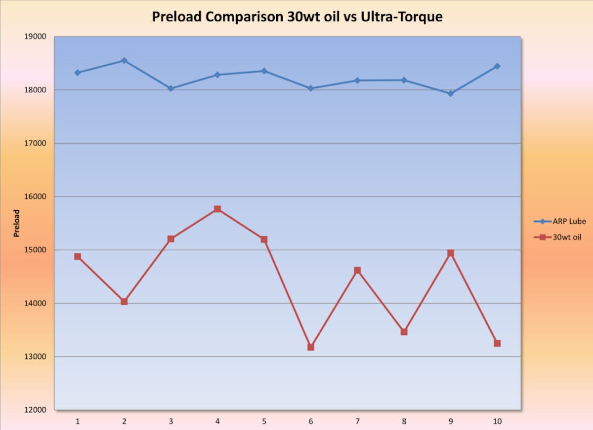 This chart shows how much more consistent ARP’s Ultra-Torque is compared to standard 30wt engine oil. Note how if you apply torque several times using oil that the load dramatically changes for the worse. The oil varied the load by as much as 17-percent while the Ultra-Torque varied by roughly 3-percent.