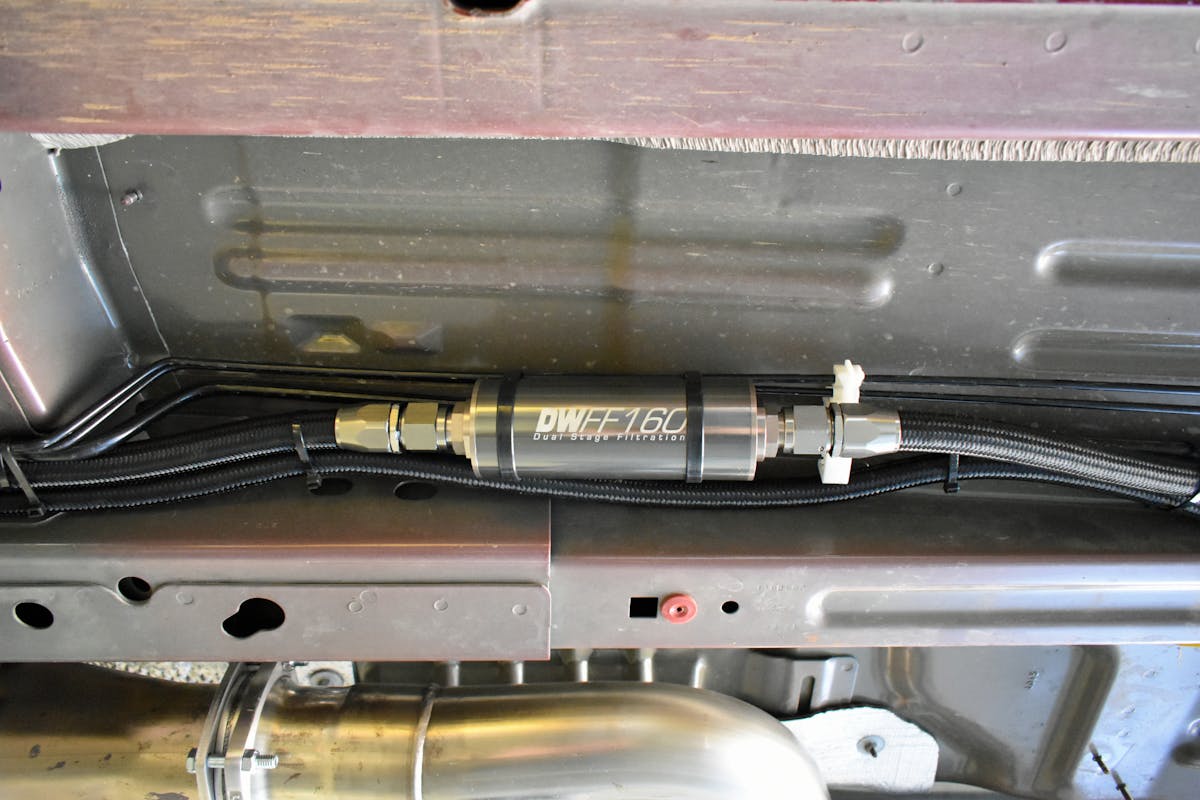 After the outlet from the pump, we also installed a DeatschWerks FF160 10-micron fuel filter. The DWFF160 uses both a 124mm-long, 304 stainless-steel mesh filter element with 65 square inches of surface area, and a neodymium magnet ring to incorporate magnetic filtration as well.