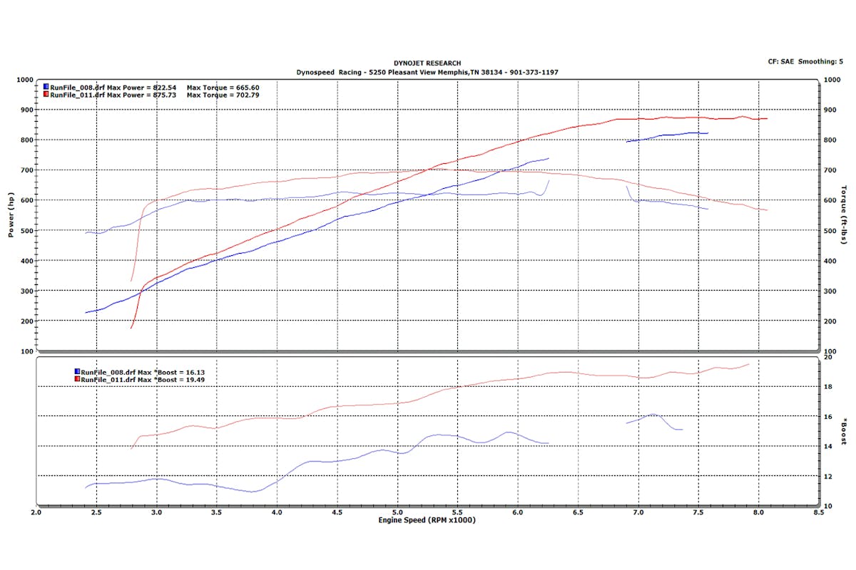 There were two more pulls made, with Lund making minor tweaks between each. The final numbers posted were 875 horsepower and 702 lb-ft of torque at the rear wheels and 19.5 psi peak boost. Not the ultimate goal, to be sure, but we reached the limit of the stock diameter crank pulley and 2.75-inch blower pulley.
