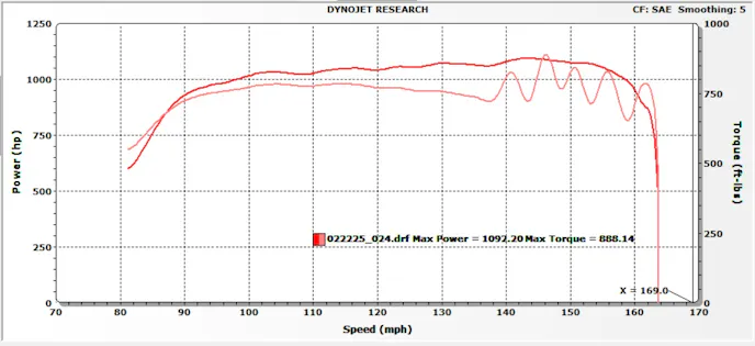 Still, once boost was added to the mix, things got pretty rowdy. We’re including the LS/LT hybrid dyno graph with this story, and you can see by the wavy torque line starting just before 140 mph, the torque converter was likely running into issues. Still, they saw 1,092 horsepower and 888 lb-ft of torque. And remember that’s now at the rear wheels and not the crankshaft!