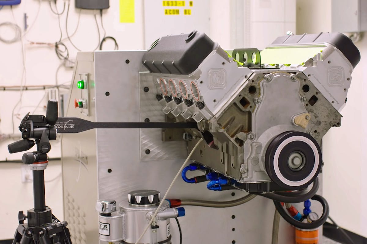 Obviously, one of the most important parts of making an engine live at elevated engine speeds is having a stable valvetrain. Here, Strader runs the engine on his in-house Spintron to validate the valvetrain components and demonstrate the system’s stability.