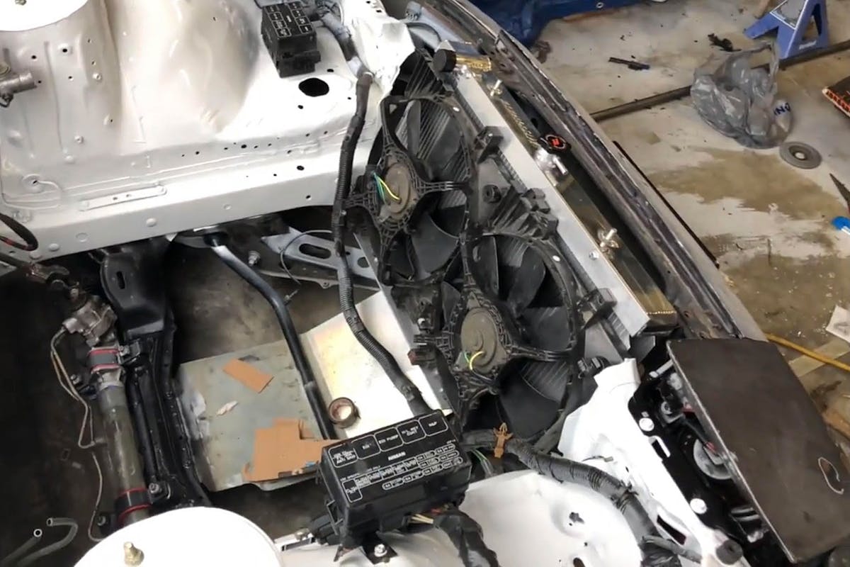 The problem with the 240’s engine bay is that it was never intended to house a six-cylinder — especially the long inline ones. Real estate was at a premium when Mayer stuck the 1JZ in, so to help draw a little more air through the Mishimoto radiator, he snipped some metal from the edges of the radiator support, bent it forward 20 degrees, and stuffed a couple of Subaru two-speed fans behind it. Simple, and, since they were sitting on top of a heap of old parts, very inexpensive.