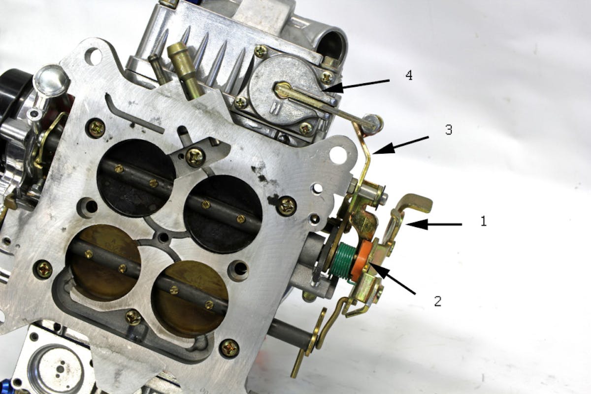 It’s common to find the throttle linkage moves 10 to 15 degrees before the accelerator pump linkage begins to move. That’s your big clue. Even better, the fix is both quick and easy. It indicates that, for whatever reason, someone has tightened the adjustment on the linkage. The proper adjustment is to set the spring-loaded linkage so there is minimal clearance between the arm and the throttle linkage at curb idle.