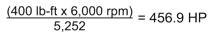 With the dyno calibrated, we can then attach an engine and accurately measure the torque exerted by the engine. Let’s say our test engine makes 400 lb-ft of torque at 4,000 rpm. The formula for computing horsepower is HP = (Torque x RPM) / 5,252. We won’t go into how this 5,252 number originated in this article, but it can be traced back to James Watt who devised a way to equate the power of his steam engines to the power of a draft horse.