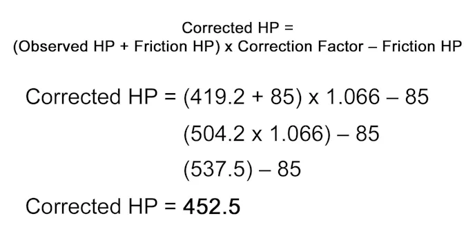 Most dyno sheets will indicate the percentage of correction factor applied to the observed numbers. In our example dyno test, the STP correction factor came to 1.066 which will add 6.6 percent to the observed numbers. However, corrected horsepower is not quite as simple as multiplying the observed numbers by the correction factor.