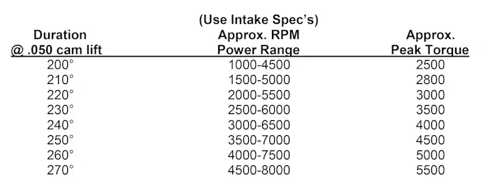 CLASS II (215° – 230° duration): Fair idle quality. Good low- to mid-range torque and horsepower. They will work with stock or modified engines and manual or automatic transmissions. A class II cam will possibly generate lower vacuum than stock.