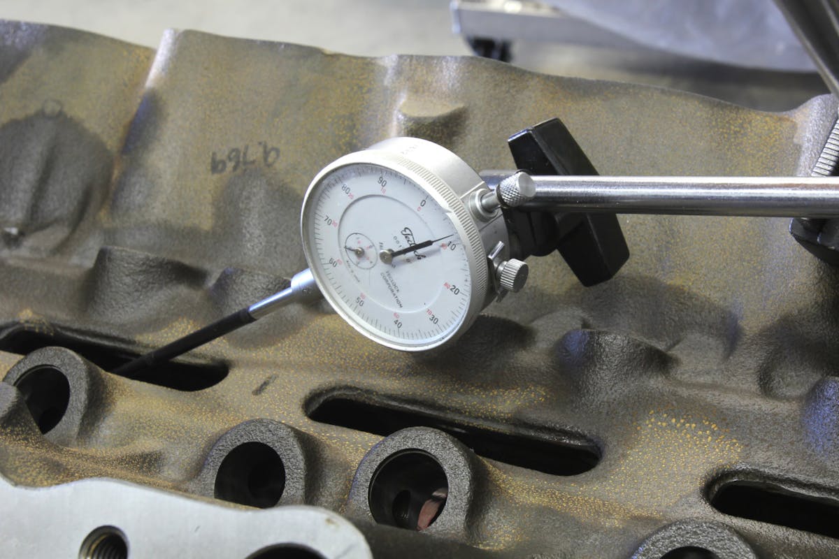 Using a stock front timing cover will require some innovative measurement techniques. We’ve used this technique of angling the dial indicator into the back side of a cam lobe on this big-block Chevy. It’s not 100-percent accurate, since we’re measuring at an angle, but it’s better than guessing at the clearance.