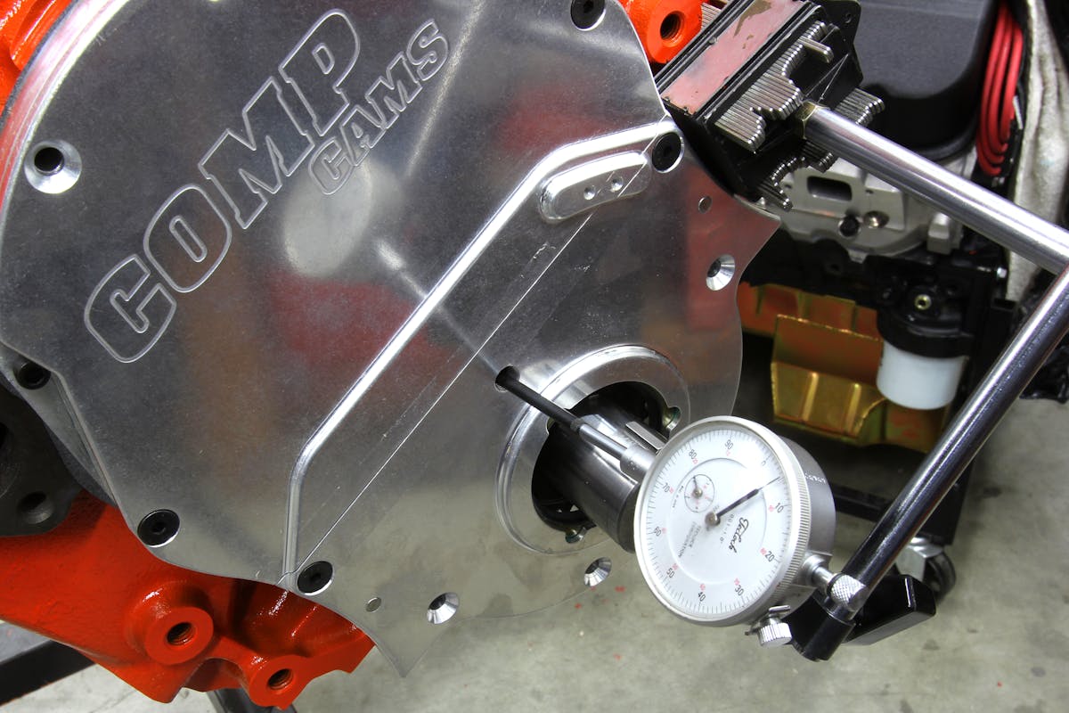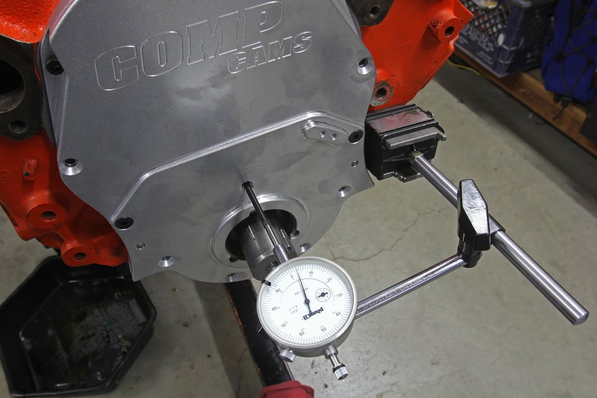 Using a stock front timing cover will require some innovative measurement techniques. We’ve used this technique of angling the dial indicator into the back side of a cam lobe on this big-block Chevy. It’s not 100-percent accurate, since we’re measuring at an angle, but it’s better than guessing at the clearance.