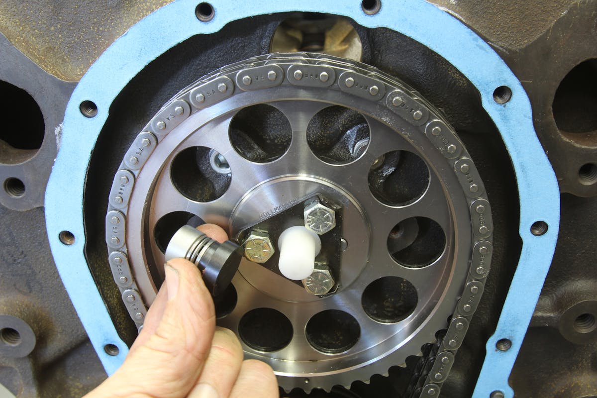 Several companies have come up with innovative ways to adjust cam movement. One of our favorites is the Cloyes Quick Button which is a two-piece aluminum timing cover that incorporates an eccentric in the center of the cover. Once the cover and gasket have been installed and the center adjuster is in place, you can turn the center adjuster counterclockwise until it bottoms out. Next, making sure the cam is fully retracted into the engine, you turn the adjuster clockwise in until it contacts the cam. Finally, back the adjuster out an eighth of a turn. This will create roughly a 0.003-inch clearance. Because the cover is aluminum, it will grow slightly when the engine warms up, which will create additional clearance.