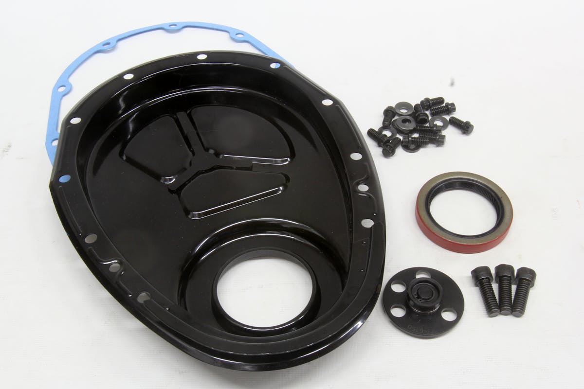 (Right) If you are using a stock timing cover as we did with this roller-cammed big-block that was masquerading as an early 427 engine, we used a nylon button to minimize wear on the timing cover. The only issue here might be a minor amount of cover deflection. (Left) Comp’s stamped steel timing cover for a small-block Chevy employs a steel insert in the middle of the cover to accept the cam button. The kit also comes with a nice rollerized button, gasket, seal, and fasteners.