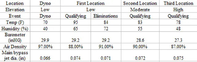 The main bypass jet size of 0.066-inch diameter was originally determined from the dynamometer test with an AFR at 4.9 to 1 for best power. When the main bypass jet size is not changed for an air density change such as this, the engine performance varies dramatically. For example, if the 0.066-inch diameter main bypass from the dyno test was instead run in the engine for the 1st location, we calculated the AFR would be 4.5 to 1. That is a lot richer than the best power AFR of 4.9 to 1. Without jetting compensation, this reduces power by about 30 horsepower for that lower air density with poor response out of the turns.