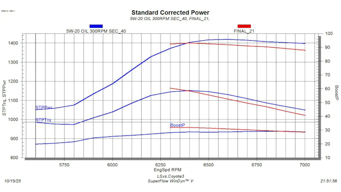 The results prove that well-built engines can offer quite similar performance when given the same power adder. Now the question is, would a bigger LT have defeated the Coyote with the same power adder? Our theory on that one is, the turbo was already maxed out, so making the LT larger would have maxed the turbo out sooner in the RPM band. The LT’s torque number would have been much larger, but it wouldn’t have translated to horsepower numbers, mathematically, and the Coyote would have still taken the win.