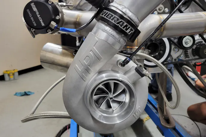 Per the rules, both teams were forced to run HPT Turbo’s F3 76mm compressor side with identical 80mm turbine wheels. But, they were allowed to choose from the five turbine housing options offered by HPT. Both turbochargers have HPT’s “Quick Spool Technology” in the dual ceramic ball-bearing system, along with identical billet 2618 aluminum 76mm compressor wheels.